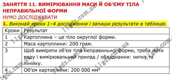 ЗАНЯТТЯ 11. ВИМІРЮВАННЯ МАСИ Й ОБ’ЄМУ ТІЛА НЕПРАВИЛЬНОЇ ФОРМИ НУМО ДОСЛІДЖУВАТИ