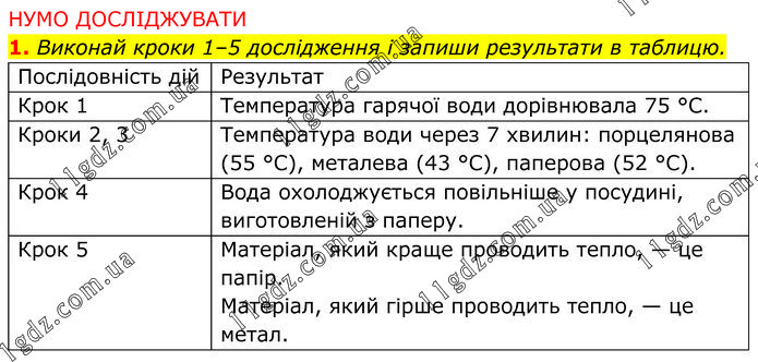 НУМО ДОСЛІДЖУВАТИ 1. Виконай кроки 1–5 дослідження і запиши результати в таблицю.