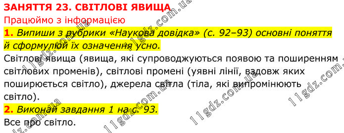 ЗАНЯТТЯ 23. СВІТЛОВІ ЯВИЩА Працюймо з інформацією 1. Випиши з рубрики «Наукова довідка» (с. 92–93) основні поняття й сформулюй їх означення усно. Світлові явища (явища, які супроводжуються появою та поширенням світлових променів), світлові промені (уявні лінії, вздовж яких поширюється світло), джерела світла (тіла, які випромінюють світло). 2. Виконай завдання 1 на с. 93. Все про світло.