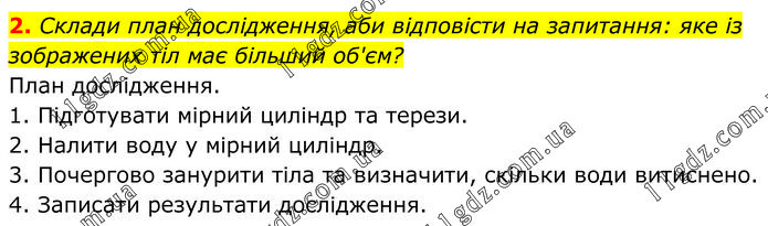 Склади план дослідження, аби відповісти на запитання: яке із зображених тіл має більший об'єм? План дослідження. 1. Підготувати мірний циліндр та терези. 2. Налити воду у мірний циліндр. 3. Почергово занурити тіла та визначити, скільки води витиснено. 4. Записати результати дослідження.