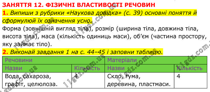 ЗАНЯТТЯ 12. ФІЗИЧНІ ВЛАСТИВОСТІ РЕЧОВИН 1. Випиши з рубрики «Наукова довідка» (с. 39) основні поняття й сформулюй їх означення усно. Форма (зовнішній вигляд тіла), розмір (ширина тіла, довжина тіла, висота тіла), маса (кількість одиниць маси), об’єм (частина простору, яку займає тіло). 2. Виконай завдання 1 на с. 44–45 і заповни таблицю.