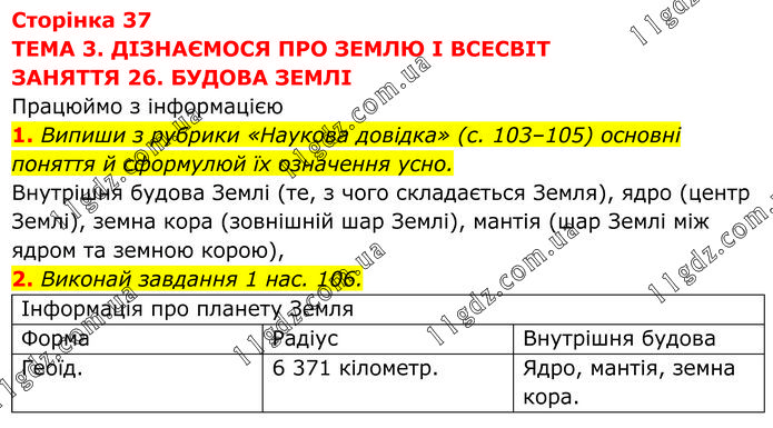 ТЕМА 3. ДІЗНАЄМОСЯ ПРО ЗЕМЛЮ І ВСЕСВІТ ЗАНЯТТЯ 26. БУДОВА ЗЕМЛІ Працюймо з інформацією 1. Випиши з рубрики «Наукова довідка» (с. 103–105) основні поняття й сформулюй їх означення усно. Внутрішня будова Землі (те, з чого складається Земля), ядро (центр Землі), земна кора (зовнішній шар Землі), мантія (шар Землі між ядром та земною корою), 2. Виконай завдання 1 нас. 106.