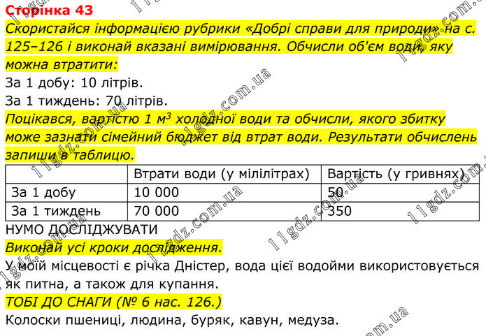 Скористайся інформацією рубрики «Добрі справи для природи» на с. 125–126 і виконай вказані вимірювання. Обчисли об'єм води, яку можна втратити: За 1 добу: 10 літрів. За 1 тиждень: 70 літрів. Поцікався, вартістю 1 м3 холодної води та обчисли, якого збитку може зазнати сімейний бюджет від втрат води. Результати обчислень запиши в таблицю. НУМО ДОСЛІДЖУВАТИ Виконай усі кроки дослідження. У моїй місцевості є річка Дністер, вода цієї водойми використовується як питна, а також для купання. ТОБІ ДО СНАГИ (№ 6 нас. 126.) Колоски пшениці, людина, буряк, кавун, медуза.