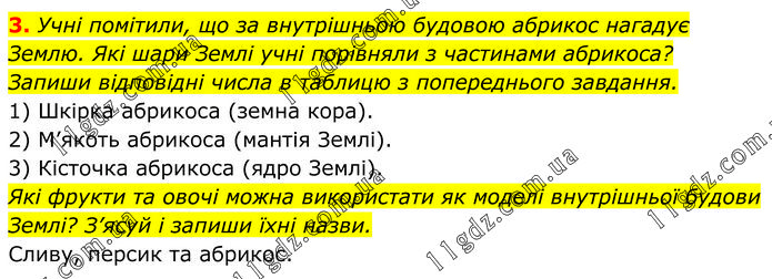 Учні помітили, що за внутрішньою будовою абрикос нагадує Землю. Які шари Землі учні порівняли з частинами абрикоса? Запиши відповідні числа в таблицю з попереднього завдання. 1) Шкірка абрикоса (земна кора). 2) М’якоть абрикоса (мантія Землі). 3) Кісточка абрикоса (ядро Землі). Які фрукти та овочі можна використати як моделі внутрішньої будови Землі? З’ясуй і запиши їхні назви. Сливу, персик та абрикос.