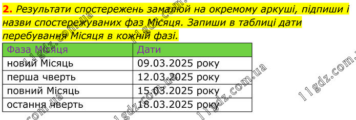 Результати спостережень замалюй на окремому аркуші, підпиши і назви спостережуваних фаз Місяця. Запиши в таблиці дати перебування Місяця в кожній фазі.