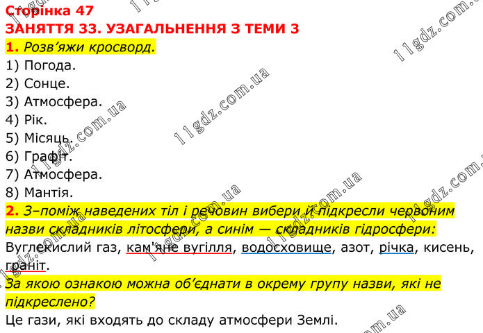 ЗАНЯТТЯ 33. УЗАГАЛЬНЕННЯ З ТЕМИ 3 1. Розв’яжи кросворд. 1) Погода. 2) Сонце. 3) Атмосфера. 4) Рік. 5) Місяць. 6) Графіт. 7) Атмосфера. 8) Мантія. 2. З–поміж наведених тіл і речовин вибери й підкресли червоним назви складників літосфери, а синім — складників гідросфери: Вуглекислий газ, кам'яне вугілля, водосховище, азот, річка, кисень, граніт. За якою ознакою можна об’єднати в окрему групу назви, які не підкреслено? Це гази, які входять до складу атмосфери Землі.
