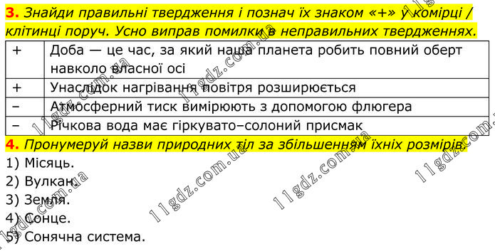 Знайди правильні твердження і познач їх знаком «+» у комірці / клітинці поруч. Усно виправ помилки в неправильних твердженнях. 4. Пронумеруй назви природних тіл за збільшенням їхніх розмірів. 1) Місяць. 2) Вулкан. 3) Земля. 4) Сонце. 5) Сонячна система.