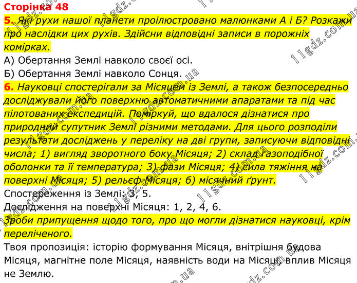 5. Які рухи нашої планети проілюстровано малюнками А і Б? Розкажи про наслідки цих рухів. Здійсни відповідні записи в порожніх комірках. А) Обертання Землі навколо своєї осі. Б) Обертання Землі навколо Сонця. 6. Науковці спостерігали за Місяцем із Землі, а також безпосередньо досліджували його поверхню автоматичними апаратами та під час пілотованих експедицій. Поміркуй, що вдалося дізнатися про природний супутник Землі різними методами. Для цього розподіли результати досліджень у переліку на дві групи, записуючи відповідні числа; 1) вигляд зворотного боку Місяця; 2) склад газоподібної оболонки та її температура; 3) фази Місяця; 4) сила тяжіння на поверхні Місяця; 5) рельєф Місяця; б) місячний ґрунт. Спостереження із Землі: 3, 5. Дослідження на поверхні Місяця: 1, 2, 4, 6. Зроби припущення щодо того, про що могли дізнатися науковці, крім переліченого. Твоя пропозиція: історію формування Місяця, внітрішня будова Місяця, магнітне поле Місяця, наявність води на Місяці, вплив Місяця не Землю.