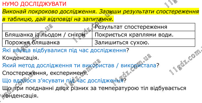 НУМО ДОСЛІДЖУВАТИ Виконай покроково дослідження. Запиши результати спостереження в таблицю, дай відповіді на запитання. Які явища відбувалися під час дослідження? Конденсація. Який метод дослідження ти використав / використала? Спостереження, експеримент. Що вдалося з’ясувати під час дослідження? Що при поєднанні двох різних за температурою тіл відбувається конденсація.