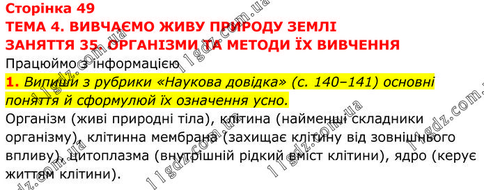ТЕМА 4. ВИВЧАЄМО ЖИВУ ПРИРОДУ ЗЕМЛІ ЗАНЯТТЯ 35. ОРГАНІЗМИ ТА МЕТОДИ ЇХ ВИВЧЕННЯ Працюймо з інформацією 1. Випиши з рубрики «Наукова довідка» (с. 140–141) основні поняття й сформулюй їх означення усно. Організм (живі природні тіла), клітина (найменші складники організму), клітинна мембрана (захищає клітину від зовнішнього впливу), цитоплазма (внутрішній рідкий вміст клітини), ядро (керує життям клітини).