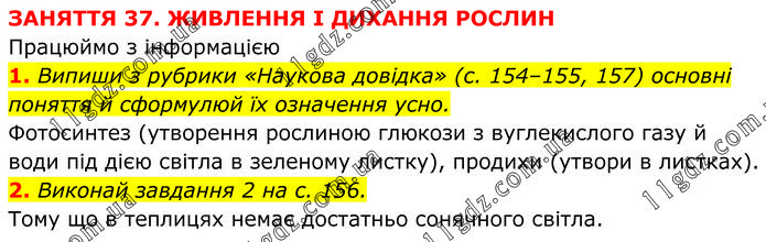 ЗАНЯТТЯ 37. ЖИВЛЕННЯ І ДИХАННЯ РОСЛИН Працюймо з інформацією 1. Випиши з рубрики «Наукова довідка» (с. 154–155, 157) основні поняття й сформулюй їх означення усно. Фотосинтез (утворення рослиною глюкози з вуглекислого газу й води під дією світла в зеленому листку), продихи (утвори в листках). 2. Виконай завдання 2 на с. 156. Тому що в теплицях немає достатньо сонячного світла.
