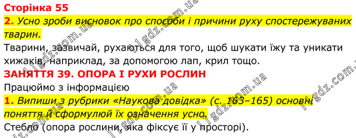 2. Усно зроби висновок про способи і причини руху спостережуваних тварин. Тварини, зазвичай, рухаються для того, щоб шукати їжу та уникати хижаків, наприклад, за допомогою лап, крил тощо. ЗАНЯТТЯ 39. ОПОРА І РУХИ РОСЛИН Працюймо з інформацією 1. Випиши з рубрики «Наукова довідка» (с. 163–165) основні поняття й сформулюй їх означення усно. Стебло (опора рослини, яка фіксує її у просторі).