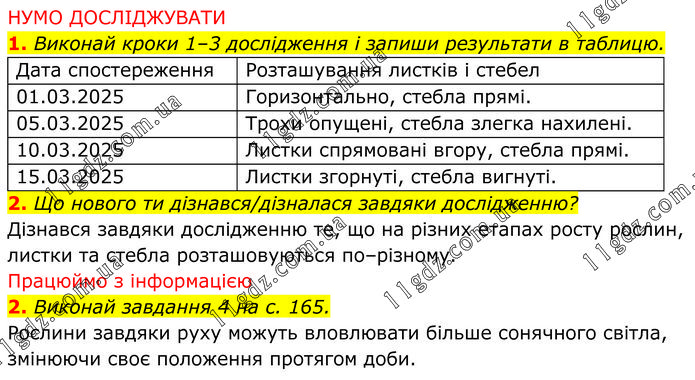 НУМО ДОСЛІДЖУВАТИ 1. Виконай кроки 1–3 дослідження і запиши результати в таблицю. 2. Що нового ти дізнався/дізналася завдяки дослідженню? Дізнався завдяки дослідженню те, що на різних етапах росту рослин, листки та стебла розташовуються по–різному. Працюймо з інформацією 2. Виконай завдання 4 на с. 165. Рослини завдяки руху можуть вловлювати більше сонячного світла, змінюючи своє положення протягом доби.