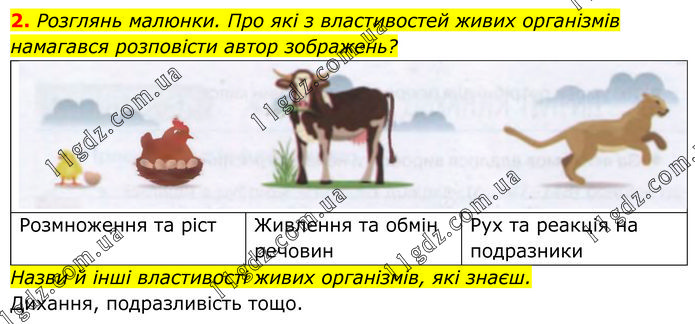 2. Розглянь малюнки. Про які з властивостей живих організмів намагався розповісти автор зображень? Назви й інші властивості живих організмів, які знаєш. Дихання, подразливість тощо.