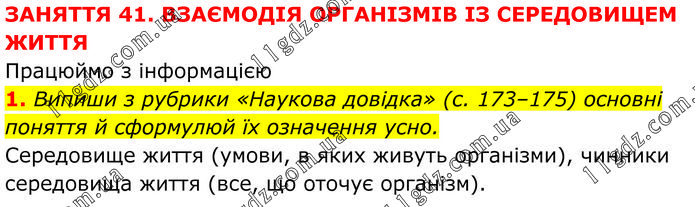 ЗАНЯТТЯ 41. ВЗАЄМОДІЯ ОРГАНІЗМІВ ІЗ СЕРЕДОВИЩЕМ ЖИТТЯ Працюймо з інформацією 1. Випиши з рубрики «Наукова довідка» (с. 173–175) основні поняття й сформулюй їх означення усно. Середовище життя (умови, в яких живуть організми), чинники середовища життя (все, що оточує організм).