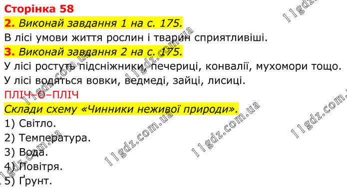 2. Виконай завдання 1 на с. 175. В лісі умови життя рослин і тварин сприятливіші. 3. Виконай завдання 2 на с. 175. У лісі ростуть підсніжники, печериці, конвалії, мухомори тощо. У лісі водяться вовки, ведмеді, зайці, лисиці. ПЛІЧ–О–ПЛІЧ Склади схему «Чинники неживої природи». 1) Світло. 2) Температура. 3) Вода. 4) Повітря. 5) Ґрунт.