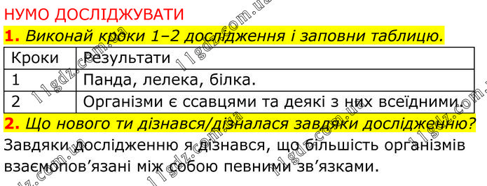НУМО ДОСЛІДЖУВАТИ 1. Виконай кроки 1–2 дослідження і заповни таблицю. 2. Що нового ти дізнався/дізналася завдяки дослідженню? Завдяки дослідженню я дізнався, що більшість організмів взаємопов’язані між собою певними зв’язками.