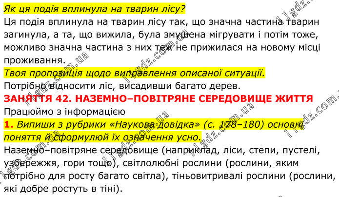 Як ця подія вплинула на тварин лісу? Ця подія вплинула на тварин лісу так, що значна частина тварин загинула, а та, що вижила, була змушена мігрувати і потім тоже, можливо значна частина з них теж не прижилася на новому місці проживання. Твоя пропозиція щодо виправлення описаної ситуації. Потрібно відносити ліс, висадивши багато дерев. ЗАНЯТТЯ 42. НАЗЕМНО–ПОВІТРЯНЕ СЕРЕДОВИЩЕ ЖИТТЯ Працюймо з інформацією 1. Випиши з рубрики «Наукова довідка» (с. 178–180) основні поняття й сформулюй їх означення усно. Наземно–повітряне середовище (наприклад, ліси, степи, пустелі, узбережжя, гори тощо), світлолюбні рослини (рослини, яким потрібно для росту багато світла), тіньовитривалі рослини (рослини, які добре ростуть в тіні).
