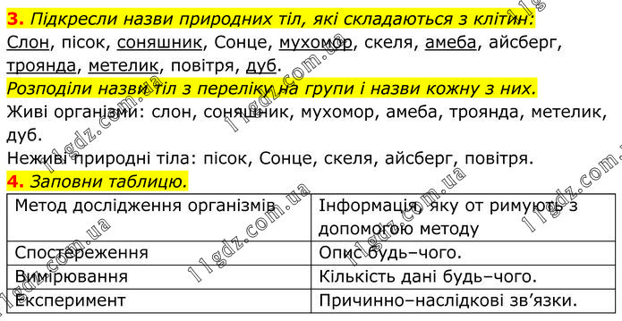 3. Підкресли назви природних тіл, які складаються з клітин: Слон, пісок, соняшник, Сонце, мухомор, скеля, амеба, айсберг, троянда, метелик, повітря, дуб. Розподіли назви тіл з переліку на групи і назви кожну з них. Живі організми: слон, соняшник, мухомор, амеба, троянда, метелик, дуб. Неживі природні тіла: пісок, Сонце, скеля, айсберг, повітря. 4. Заповни таблицю.
