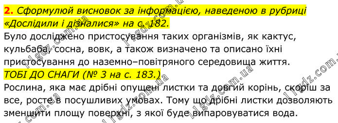Сформулюй висновок за інформацією, наведеною в рубриці «Дослідили і дізналися» на с. 182. Було досліджено пристосування таких організмів, як кактус, кульбаба, сосна, вовк, а також визначено та описано їхні пристосування до наземно–повітряного середовища життя. ТОБІ ДО СНАГИ (№ 3 на с. 183.) Рослина, яка має дрібні опущені листки та довгий корінь, скоріш за все, росте в посушливих умовах. Тому що дрібні листки дозволяють зменшити площу поверхні, з якої буде випаровуватися вода.