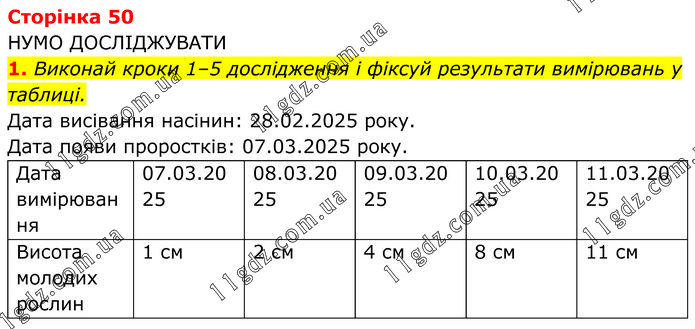 НУМО ДОСЛІДЖУВАТИ 1. Виконай кроки 1–5 дослідження і фіксуй результати вимірювань у таблиці. Дата висівання насінин: 28.02.2025 року. Дата появи проростків: 07.03.2025 року.