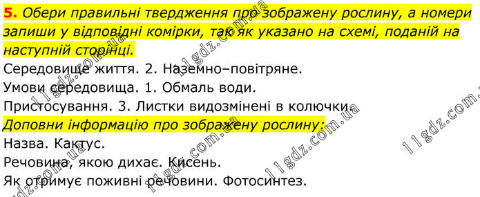 Обери правильні твердження про зображену рослину, а номери запиши у відповідні комірки, так як указано на схемі, поданій на наступній сторінці. Середовище життя. 2. Наземно–повітряне. Умови середовища. 1. Обмаль води. Пристосування. 3. Листки видозмінені в колючки. Доповни інформацію про зображену рослину: Назва. Кактус. Речовина, якою дихає. Кисень. Як отримує поживні речовини. Фотосинтез.