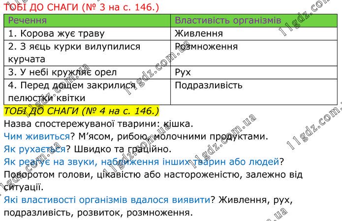 ТОБІ ДО СНАГИ (№ 3 на с. 146.) ТОБІ ДО СНАГИ (№ 4 на с. 146.) Назва спостережуваної тварини: кішка. Чим живиться? М’ясом, рибою, молочними продуктами. Як рухається? Швидко та граційно. Як реагує на звуки, наближення інших тварин або людей? Поворотом голови, цікавістю або настороженістю, залежно від ситуації. Які властивості організмів вдалося виявити? Живлення, рух, подразливість, розвиток, розмноження.