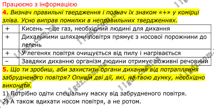 Працюємо з інформацією 4. Визнач правильні твердження і познач їх знаком «+» у комірці зліва. Усно виправ помилки в неправильних твердженнях. 5. Що ти зробиш, аби захистити органи дихання від потрапляння забрудненого повітря? Опиши дві дії, які, на твою думку, необхідно виконати. 1) Потрібно одіти спеціальну маску від забрудненого повітря. 2) А також вдихати носом повітря, а не ротом.