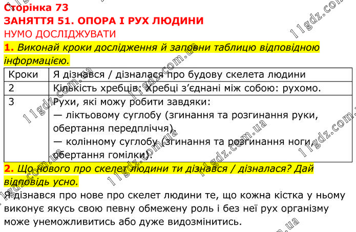 ЗАНЯТТЯ 51. ОПОРА І РУХ ЛЮДИНИ НУМО ДОСЛІДЖУВАТИ 1. Виконай кроки дослідження й заповни таблицю відповідною інформацією. 2. Що нового про скелет людини ти дізнався / дізналася? Дай відповідь усно. Я дізнався про нове про скелет людини те, що кожна кістка у ньому виконує якусь свою певну обмежену роль і без неї рух організму може унеможливитись або дуже видозмінитись.