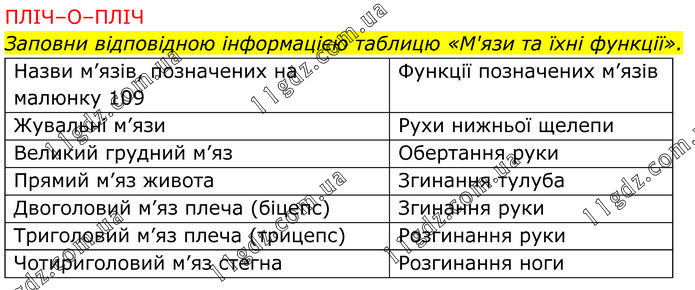 ПЛІЧ–О–ПЛІЧ Заповни відповідною інформацією таблицю «М'язи та їхні функції».