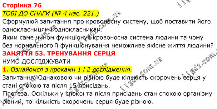 ТОБІ ДО СНАГИ (№ 4 нас. 221.) Сформулюй запитання про кровоносну систему, щоб поставити його однокласницям і однокласникам. Яким саме чином функціонує кровоносна система людини та чому без нормального її функціонування неможливе якісне життя людини? ЗАНЯТТЯ 53. ТРЕНУВАННЯ СЕРЦЯ НУМО ДОСЛІДЖУВАТИ 1. Ознайомся з кроками 1 і 2 дослідження. Запитання. Однаковою чи різною буде кількість скорочень серця у стані спокою та після 15 присідань. Гіпотеза. Оскільки у спокої та після присідань стан спокою організму різний, то кількість скорочень серця буде різною.