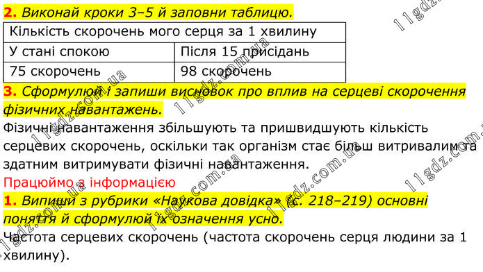 2. Виконай кроки 3–5 й заповни таблицю. 3. Сформулюй і запиши висновок про вплив на серцеві скорочення фізичних навантажень. Фізичні навантаження збільшують та пришвидшують кількість серцевих скорочень, оскільки так організм стає більш витривалим та здатним витримувати фізичні навантаження. Працюймо з інформацією 1. Випиши з рубрики «Наукова довідка» (с. 218–219) основні поняття й сформулюй їх означення усно. Частота серцевих скорочень (частота скорочень серця людини за 1 хвилину).