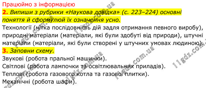 Працюймо з інформацією 2. Випиши з рубрики «Наукова довідка» (с. 223–224) основні поняття й сформулюй їх означення усно. Технології (чітка послідовність дій задля отримання певного виробу), природні матеріали (матеріали, які були здобуті від природи), штучні матеріали (матеріали, які були створені у штучних умовах людиною). 3. Заповни схему. Звукові (робота пральної машинки). Світлові (робота лампочки та освітлювальних приладів). Теплові (робота газового котла та газової плитки). Механічні (робота шафи).