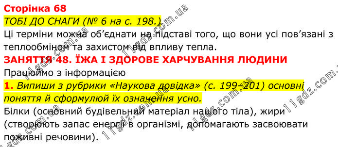 ТОБІ ДО СНАГИ (№ 6 на с. 198.) Ці терміни можна об’єднати на підставі того, що вони усі пов’язані з теплообміном та захистом від впливу тепла. ЗАНЯТТЯ 48. ЇЖА І ЗДОРОВЕ ХАРЧУВАННЯ ЛЮДИНИ Працюймо з інформацією 1. Випиши з рубрики «Наукова довідка» (с. 199–201) основні поняття й сформулюй їх означення усно. Білки (основний будівельний матеріал нашого тіла), жири (створюють запас енергії в організмі, допомагають засвоювати поживні речовини).