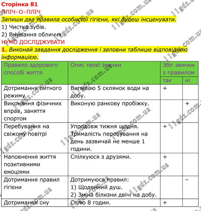 ПЛІЧ–О–ПЛІЧ Запиши два правила особистої гігієни, які будеш інсценувати. 1) Чистка зубів. 2) Вмивання обличчя. НУМО ДОСЛІДЖУВАТИ 1. Виконай завдання дослідження і заповни таблицю відповідною інформацією.