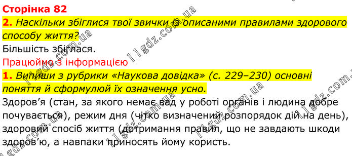 2. Наскільки збіглися твої звички із описаними правилами здорового способу життя? Більшість збіглася. Працюймо з інформацією 1. Випиши з рубрики «Наукова довідка» (с. 229–230) основні поняття й сформулюй їх означення усно. Здоров’я (стан, за якого немає вад у роботі органів і людина добре почувається), режим дня (чітко визначений розпорядок дій на день), здоровий спосіб життя (дотримання правил, що не завдають шкоди здоров’ю, а навпаки приносять йому користь.