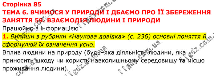 ТЕМА 6. ВЧИМОСЯ У ПРИРОДИ І ДБАЄМО ПРО ЇЇ ЗБЕРЕЖЕННЯ ЗАНЯТТЯ 59. ВЗАЄМОДІЯ ЛЮДИНИ І ПРИРОДИ Працюймо з інформацією 1. Випиши з рубрики «Наукова довідка» (с. 236) основні поняття й сформулюй їх означення усно. Вплив людини на природу (будь–яка діяльність людини, яка приносить шкоду чи користь навколишньому середовищу та місцю проживання людини).