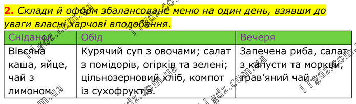 Склади й оформ збалансоване меню на один день, взявши до уваги власні харчові вподобання.