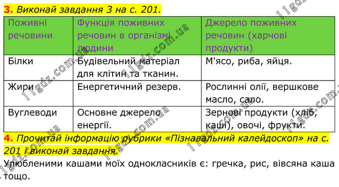 3. Виконай завдання 3 на с. 201. 4. Прочитай інформацію рубрики «Пізнавальний калейдоскоп» на с. 201 і виконай завдання. Улюбленими кашами моїх однокласників є: гречка, рис, вівсяна каша тощо.