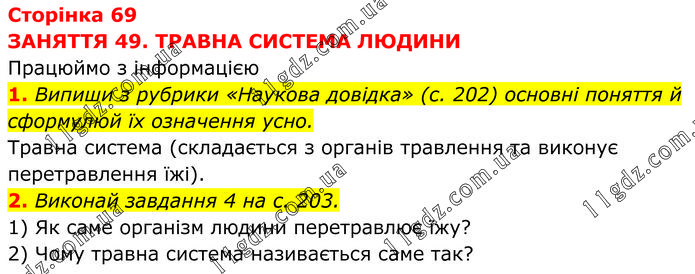 ЗАНЯТТЯ 49. ТРАВНА СИСТЕМА ЛЮДИНИ Працюймо з інформацією 1. Випиши з рубрики «Наукова довідка» (с. 202) основні поняття й сформулюй їх означення усно. Травна система (складається з органів травлення та виконує перетравлення їжі). 2. Виконай завдання 4 на с. 203. 1) Як саме організм людини перетравлює їжу? 2) Чому травна система називається саме так?