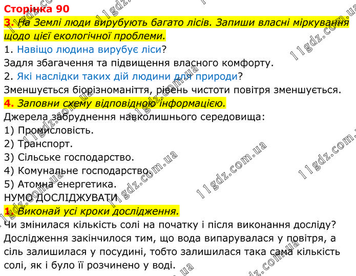 3. На Землі люди вирубують багато лісів. Запиши власні міркування щодо цієї екологічної проблеми. 1. Навіщо людина вирубує ліси? Задля збагачення та підвищення власного комфорту. 2. Які наслідки таких дій людини для природи? Зменшується біорізноманіття, рівень чистоти повітря зменшується. 4. Заповни схему відповідною інформацією. Джерела забруднення навколишнього середовища: 1) Промисловість. 2) Транспорт. 3) Сільське господарство. 4) Комунальне господарство. 5) Атомна енергетика. НУМО ДОСЛІДЖУВАТИ 1. Виконай усі кроки дослідження. Чи змінилася кількість солі на початку і після виконання досліду? Дослідження закінчилося тим, що вода випарувалася у повітря, а сіль залишилася у посудині, тобто залишилася така сама кількість солі, як і було її розчинено у воді.