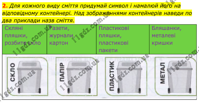 Для кожного виду сміття придумай символ і намалюй його на відповідному контейнері. Над зображеннями контейнерів наведи по два приклади назв сміття.