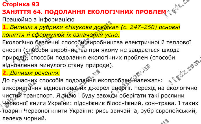 ЗАНЯТТЯ 64. ПОДОЛАННЯ ЕКОЛОГІЧНИХ ПРОБЛЕМ Працюймо з інформацією 1. Випиши з рубрики «Наукова довідка» (с. 247–250) основні поняття й сформулюй їх означення усно. Екологічно безпечні способи виробництва електричної й теплової енергії (способи виробництва при якому не завдається шкода природі), способи подолання екологічних проблем (способи відновлення минулого стану природи). 2. Допиши речення. До сучасних способів подолання екопроблем належать: використання відновлюваних джерел енергії, перехід на екологічно чистий транспорт. Я знаю і буду завжди оберігати такі рослини Червоної книги України: підсніжник білосніжний, сон–трава. І таких тварин Червоної книги України: рись звичайна, зубр європейський, лелека чорний.