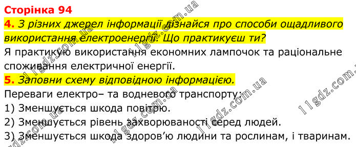 4. З різних джерел інформації дізнайся про способи ощадливого використання електроенергії. Що практикуєш ти? Я практикую використання економних лампочок та раціональне споживання електричної енергії. 5. Заповни схему відповідною інформацією. Переваги електро– та водневого транспорту: 1) Зменшується шкода повітрю. 2) Зменшується рівень захворюваності серед людей. 3) Зменшується шкода здоров’ю людини та рослинам, і тваринам.