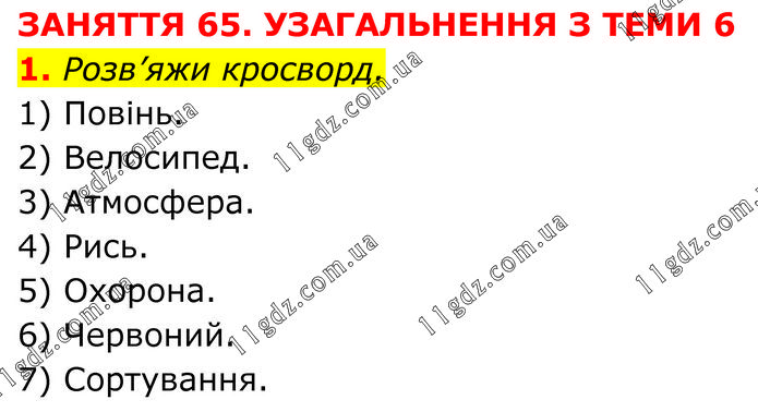 ЗАНЯТТЯ 65. УЗАГАЛЬНЕННЯ З ТЕМИ 6 1. Розв’яжи кросворд. 1) Повінь. 2) Велосипед. 3) Атмосфера. 4) Рись. 5) Охорона. 6) Червоний. 7) Сортування.