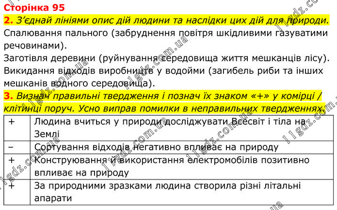 2. З’єднай лініями опис дій людини та наслідки цих дій для природи. Спалювання пального (забруднення повітря шкідливими газуватими речовинами). Заготівля деревини (руйнування середовища життя мешканців лісу). Викидання відходів виробництв у водойми (загибель риби та інших мешканів водного середовища). 3. Визнач правильні твердження і познач їх знаком «+» у комірці / клітинці поруч. Усно виправ помилки в неправильних твердженнях.