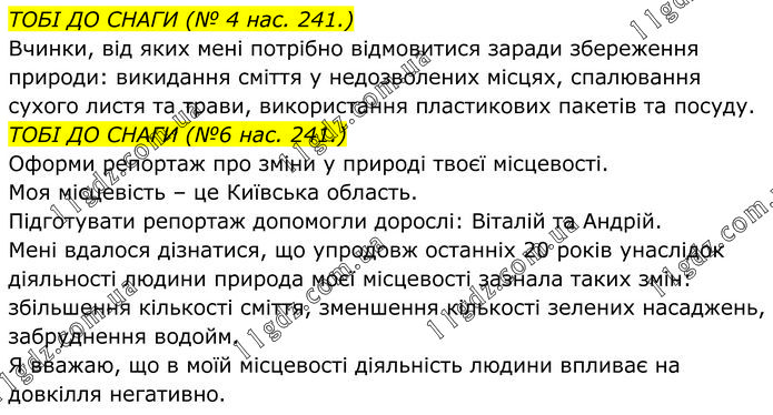 ТОБІ ДО СНАГИ (№ 4 нас. 241.) Вчинки, від яких мені потрібно відмовитися заради збереження природи: викидання сміття у недозволених місцях, спалювання сухого листя та трави, використання пластикових пакетів та посуду. ТОБІ ДО СНАГИ (№6 нас. 241.) Оформи репортаж про зміни у природі твоєї місцевості. Моя місцевість – це Київська область. Підготувати репортаж допомогли дорослі: Віталій та Андрій. Мені вдалося дізнатися, що упродовж останніх 20 років унаслідок діяльності людини природа моєї місцевості зазнала таких змін: збільшення кількості сміття, зменшення кількості зелених насаджень, забруднення водойм. Я вважаю, що в моїй місцевості діяльність людини впливає на довкілля негативно.