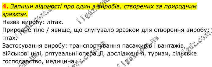 Запиши відомості про один з виробів, створених за природним зразком. Назва виробу: літак. Природне тіло / явище, що слугувало зразком для створення виробу: птах. Застосування виробу: транспортування пасажирів і вантажів, військові цілі, рятувальні операції, дослідження, туризм, сільське господарство, медицина.