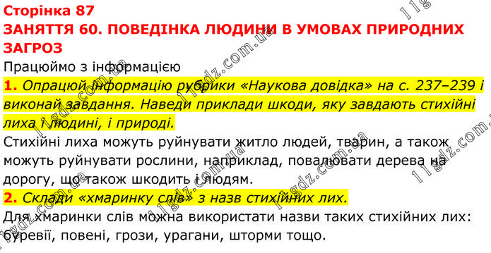ЗАНЯТТЯ 60. ПОВЕДІНКА ЛЮДИНИ В УМОВАХ ПРИРОДНИХ ЗАГРОЗ Працюймо з інформацією 1. Опрацюй інформацію рубрики «Наукова довідка» на с. 237–239 і виконай завдання. Наведи приклади шкоди, яку завдають стихійні лиха і людині, і природі. Стихійні лиха можуть руйнувати житло людей, тварин, а також можуть руйнувати рослини, наприклад, повалювати дерева на дорогу, що також шкодить і людям. 2. Склади «хмаринку слів» з назв стихійних лих. Для хмаринки слів можна використати назви таких стихійних лих: буревії, повені, грози, урагани, шторми тощо.