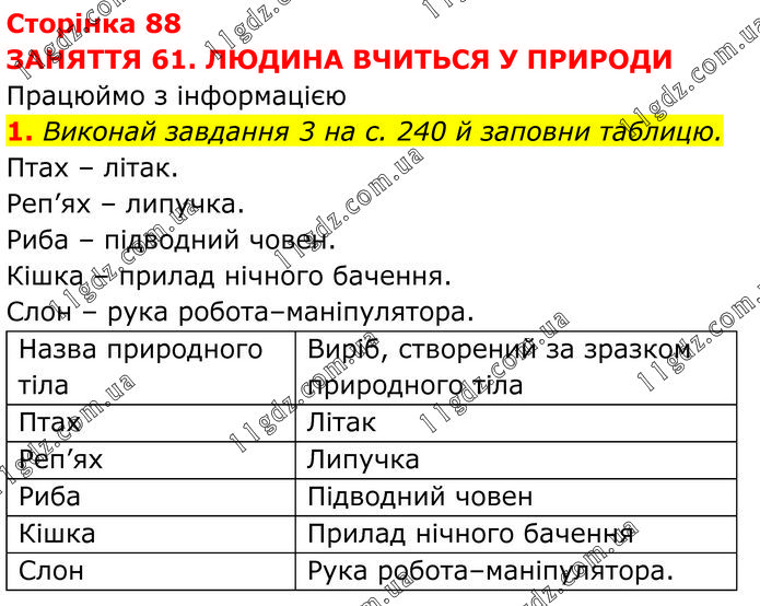 ЗАНЯТТЯ 61. ЛЮДИНА ВЧИТЬСЯ У ПРИРОДИ Працюймо з інформацією 1. Виконай завдання 3 на с. 240 й заповни таблицю. Птах – літак. Реп’ях – липучка. Риба – підводний човен. Кішка – прилад нічного бачення. Слон – рука робота–маніпулятора.